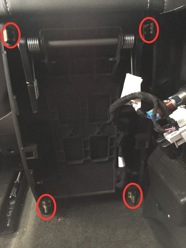 Four clips on rear of console. This is the view from the back seat.